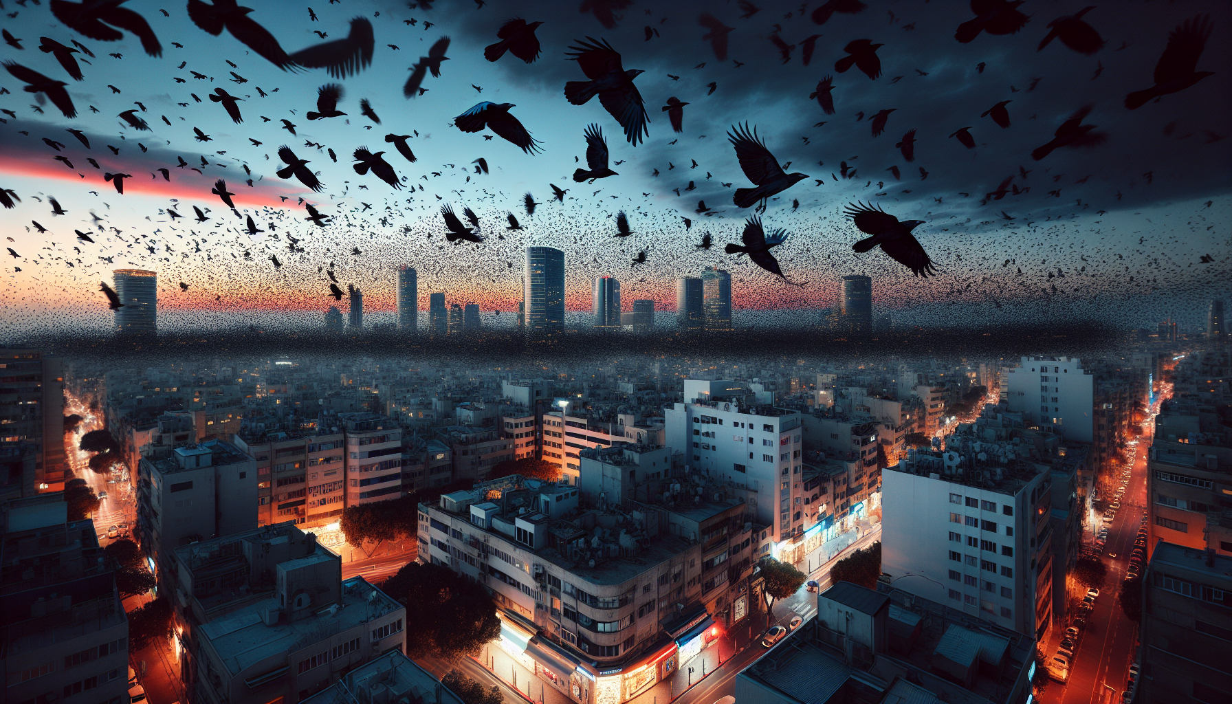 Large groups of crows soaring over Tel Aviv have attracted significant attention and stirred conspiracy theories on social media amid ongoing regional tensions. A widely shared video captures thousands of these birds filling the sky and gathering across busy urban streets, with footage taken from both street level and aerial views of the city skyline.